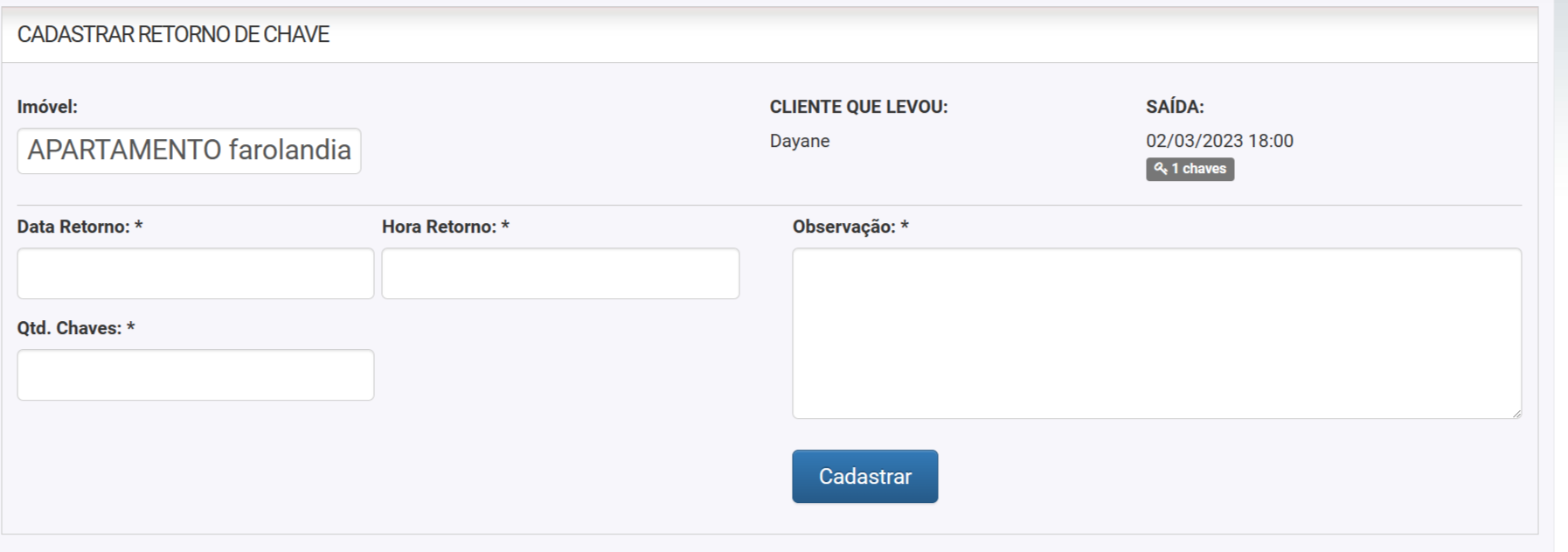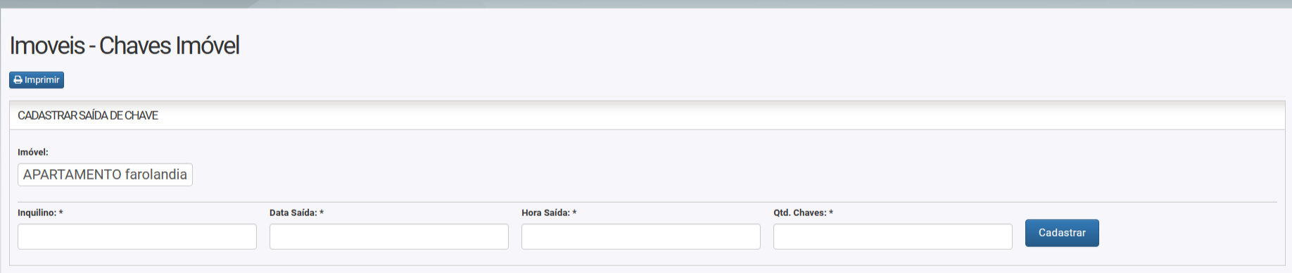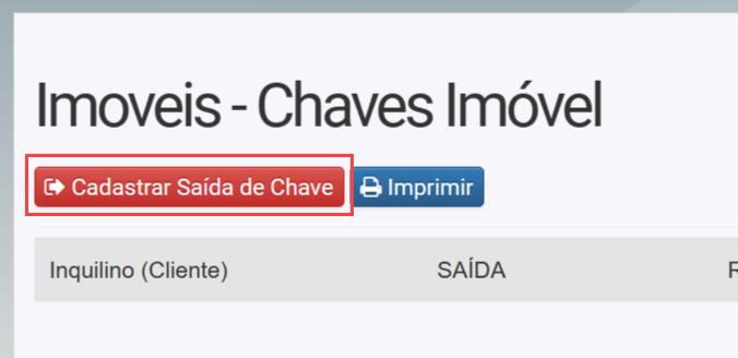 5. Vai exibir a seguinte tela, em seguir clique no Botão Cadastrar Saída de Chave