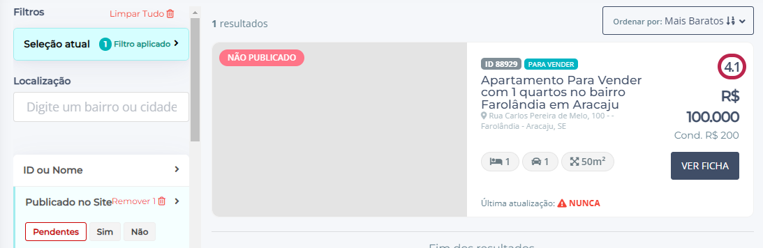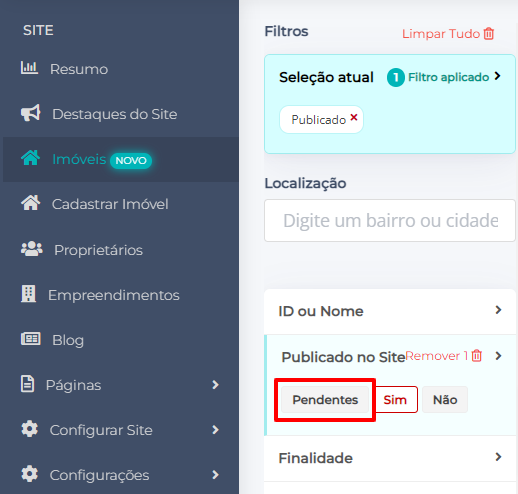 3. O sistema vai exibir no filtro Publicado no Site a opção Pendentes quando houver algum imóvel precisando de aprovação para entrar no site