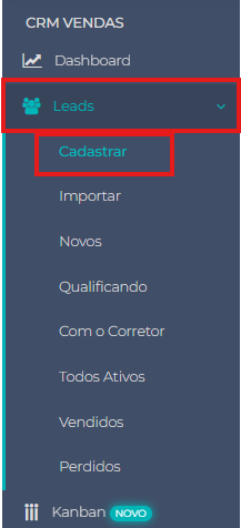 2. Clique no Menu Leads e Cadastrar.