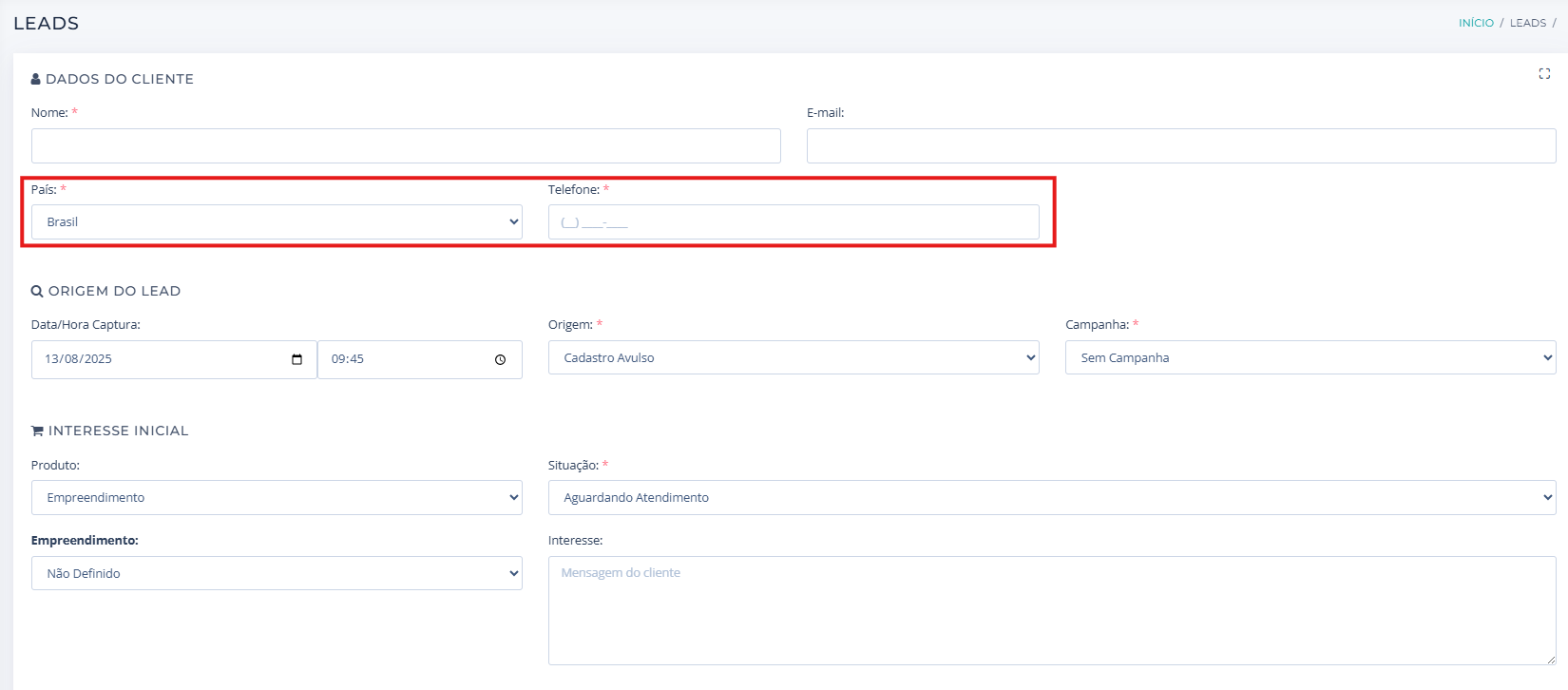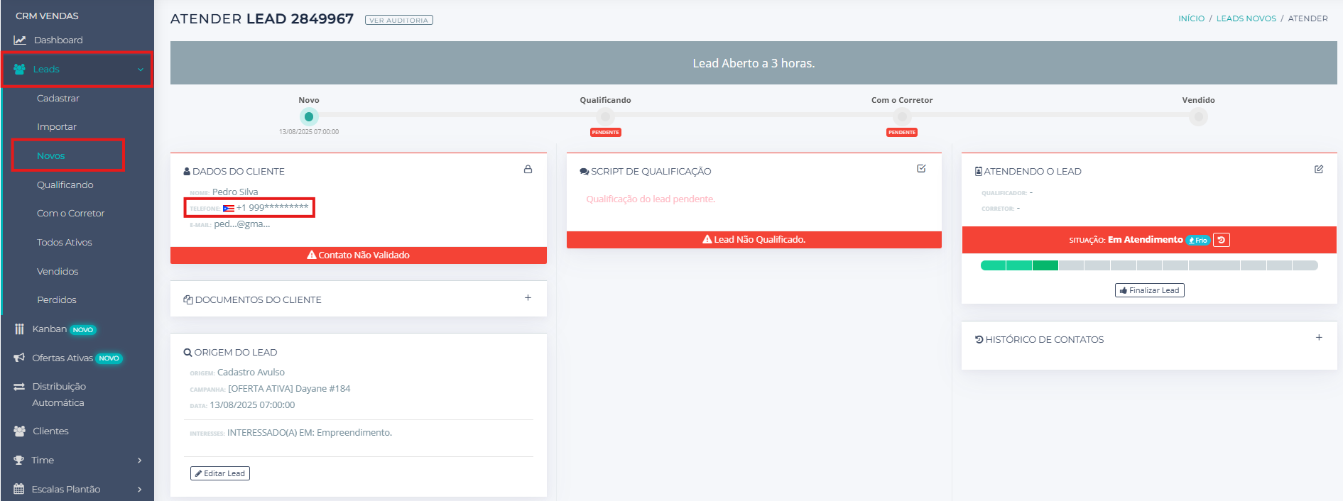 5. Ao cadastrar você vai ser redirecionado para essa nova tela no Menu Novos. Pode-se reparar que no contato do Lead cadastrado vai ter a bandeira do país selecionado e o DDD do país.