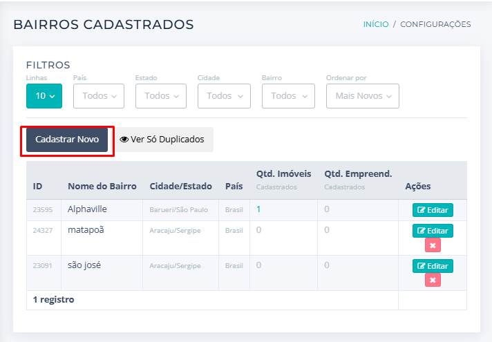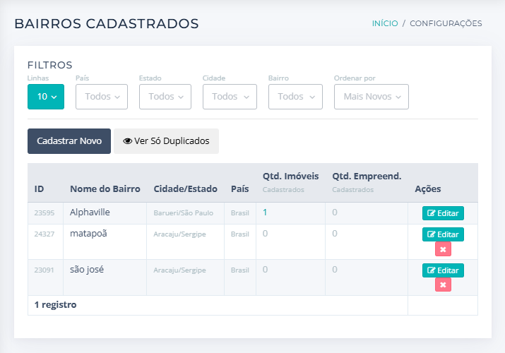 4. O Sistema vai exibir todos os bairros cadastrados