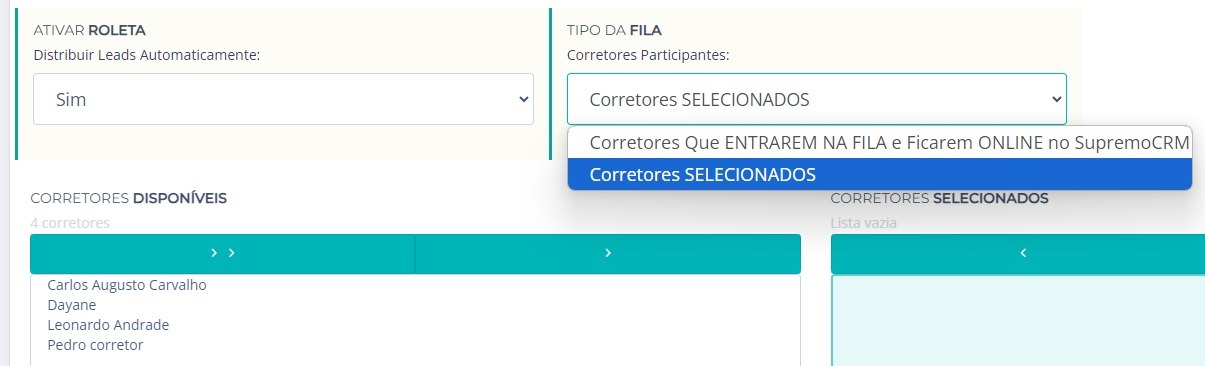 4. Selecione a opção “Sim” para ativar a Roleta e “Não” para desativar a Roleta e selecione o Tipo da Fila (Corretores que ENTRAREM NA FILA e ficarem ONLINE no Supremo CRM ou selecionar os Corretores)