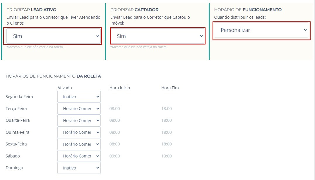 5. Configure se deseja priorizar os Leads Ativos (leads que o corretor estiver atendendo) e priorize leads do Corretor captador do imóvel, em seguida configure o horário de funcionamento da Roleta.