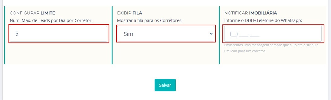 6. Em seguida configure o limite máximo de Leads por dia por Corretor, selecione se deseja exibir a fila para os Corretores saber em qual posição se encontra, e depois configure o número da Imobiliária.