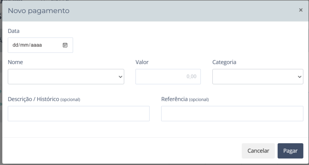 6. Vai exibir um popup, para preencher as informações do Novo Pagamento