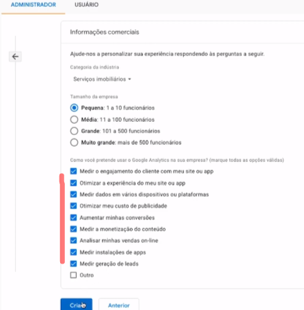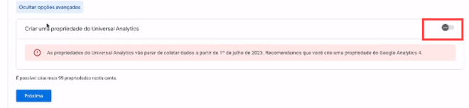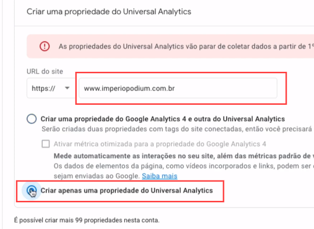 17. Insira a URL do site e marca a opção Criar apenas uma propriedade do Universal Analytics