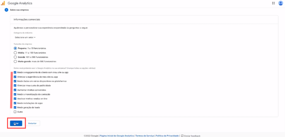 7. Configurar informações da empresa, deixa as opções abaixo marcadas e clica no Botão Criar