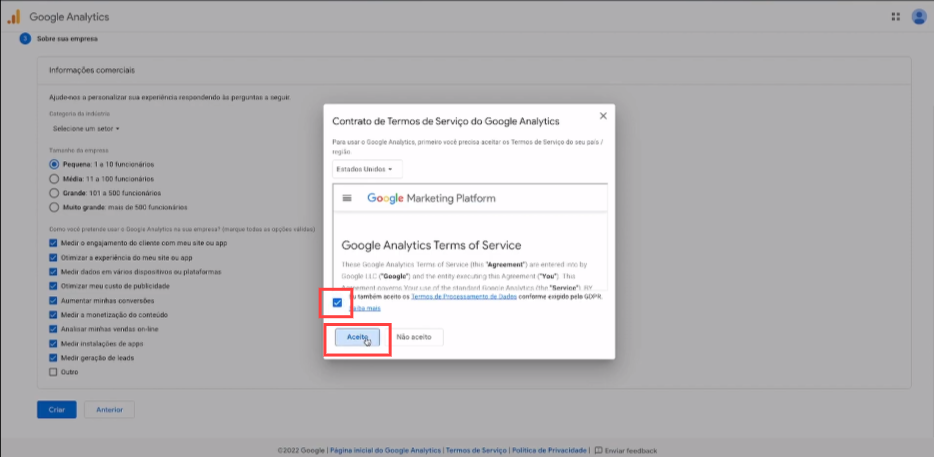 8. O Google vai exibir os termos, marca a opção e clica no Botão Aceito