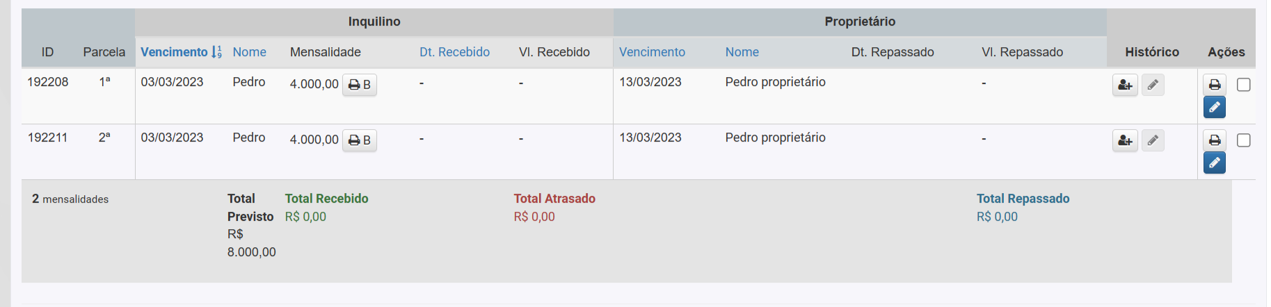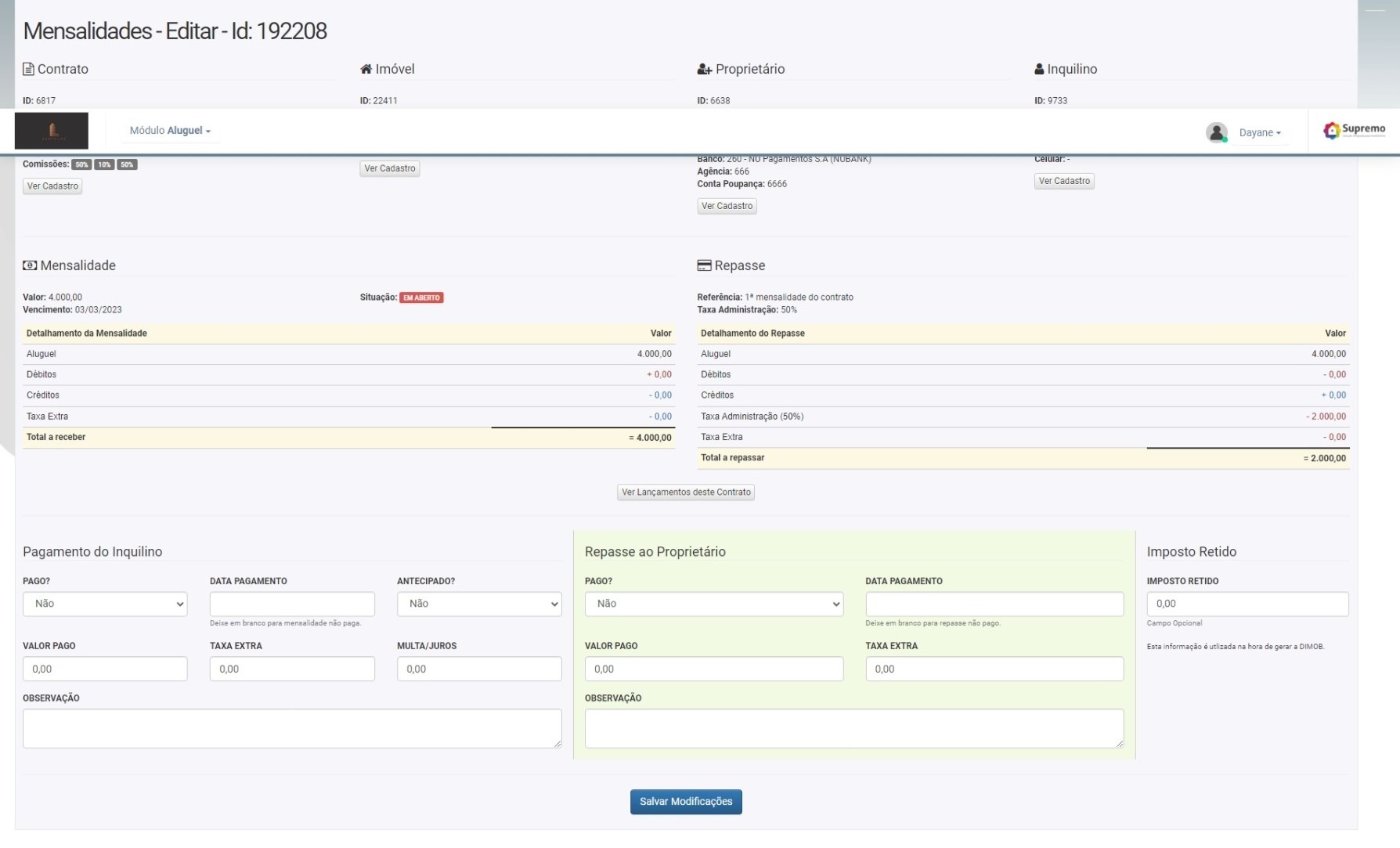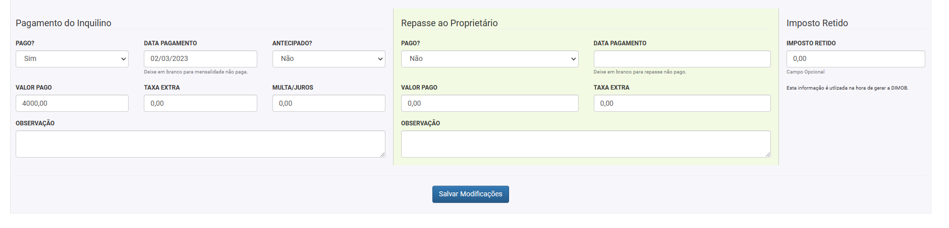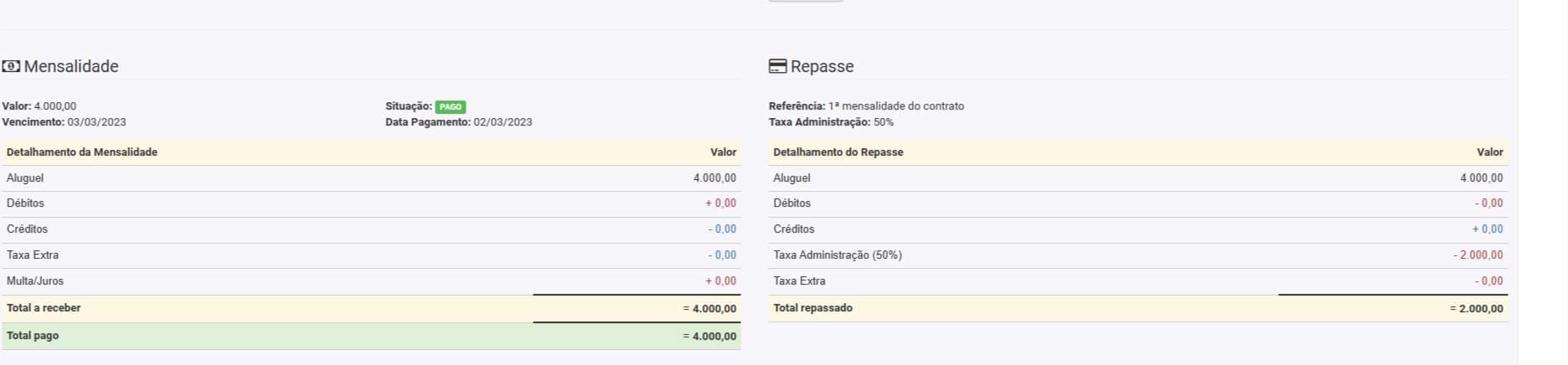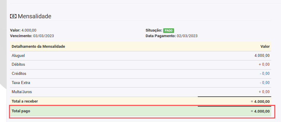 9. O sistema vai exibir que o pagamento do inquilino foi feito