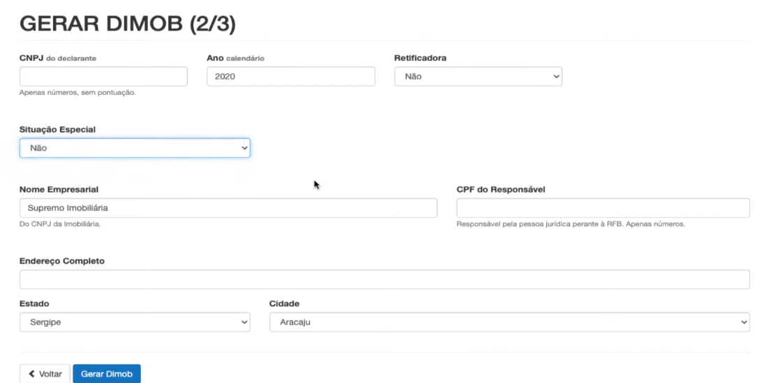 5. Preencha as informações abaixo, e clique no Botão Gerar Dimob
